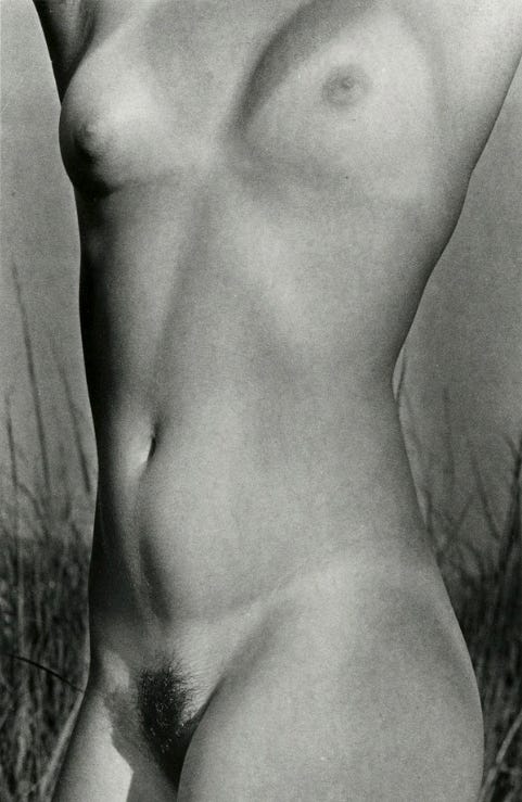 Arms raised, torso elongated, the chest lifted into the light. In the history of the female nude, this gesture is almost cliché. We’ve learned to read it as openness, vulnerability, even surrender. It exposes the breasts, softens the posture, and invites the gaze to linger. For more than a century, photographers have relied on this pose to signal availability to the viewer, particularly within the logic of the male gaze.