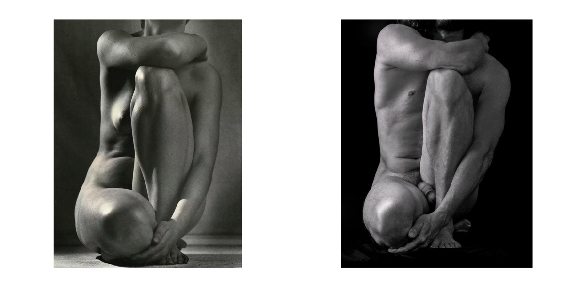 My first experiments were with what I called the Fe/Male series: pairing 20th-century photographic nudes of women with contemporary images I made of male models in nearly identical poses and lighting. Initially, I was simply inverting visual expectations from “the gaze,” as with the Ruth Bernhard image above. I was exposing assumptions about gender and beauty and about the way cultural conditioning shapes our emotional and intellectual responses to bodies.